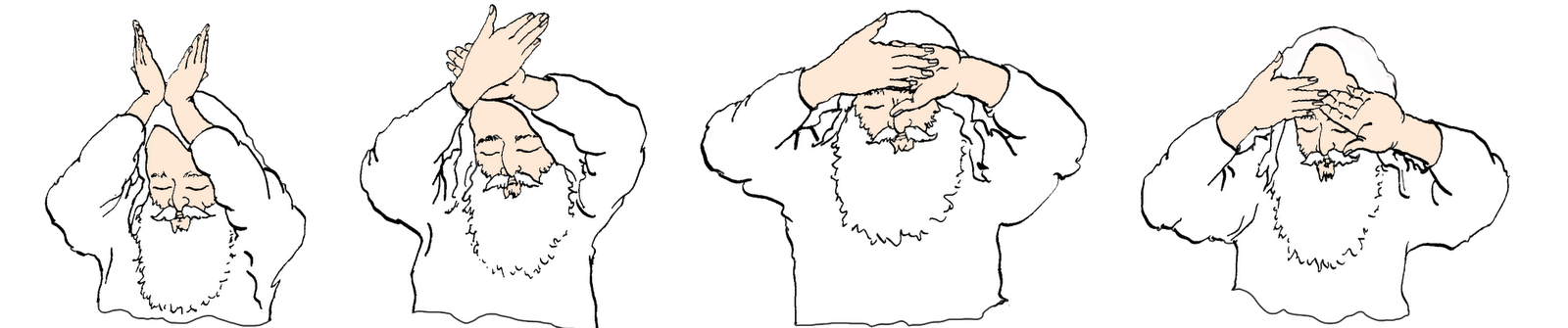 Cuando los comenzales repiten, quien hace la oración, sube las manos por encima de la cabeza, une las palmas, juntando las zonas que corresponden a la energía del Maestro de Corazón. Abriéndolas y haciendo bisagra desde la zona de DA LING… Girando una palma sobre la otra, hasta deslizarse, en señal de purificación, por el dedo medio, trayecto de Maestro Corazón.